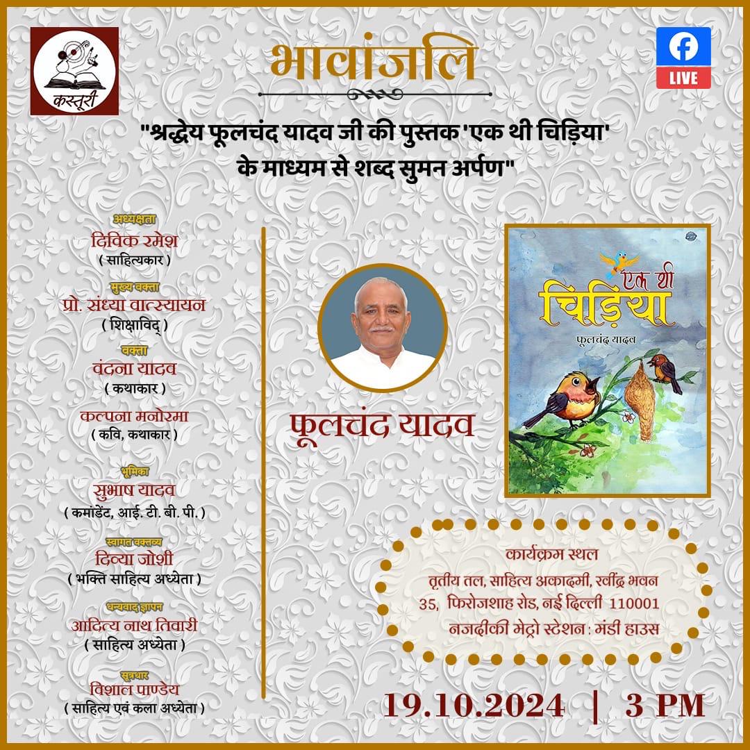 भावांजलि कार्यक्रम 19 अक्टूबर को अपरान्ह 3 बजे से तृतीय तल, साहित्य अकादमी, रवींद्र भवन, 35 फिरोजशाह रोड, नई दिल्ली- 110001 नजदीकी मेट्रो स्टेशन मंडी हाउस में आयोजित होगा।इस कार्यक्रम से साहित्यप्रेमी कस्तूरी के फेसबुक पेज से जुड़कर लाइव देख सकेंगे।
