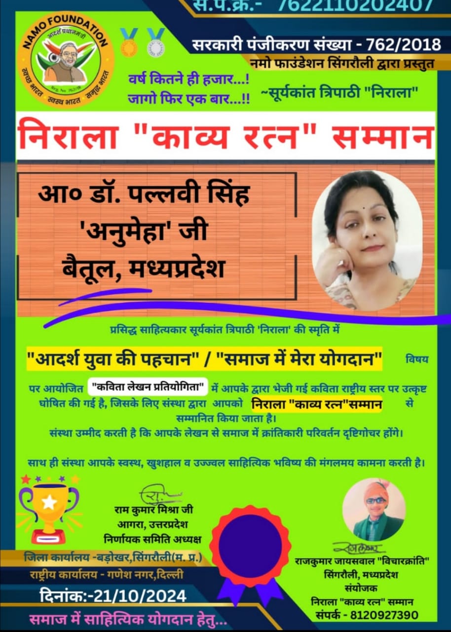 बैतूल- नगर के साहित्यकार स्व.श्री नरेन्द्र पाल सिंह पुण्डीर की साहित्यकार बेटी डॉ. पल्लवी सिंह ‘अनुमेहा’ को पुनः राजकुमार जायसवाल विचारक्रांति के नेतृत्व में नमो फाउंडेशन, सिंगरौली द्वारा हिन्दी साहित्य के प्रसिद्ध कवि /लेखक सूर्यकांत त्रिपाठी ‘निराला’ की स्मृति में आयोजित कविता लेखन प्रतियोगिता में चयनित होने के उपरांत *निराला “काव्य रत्न” सम्मान* से सम्मानित किया गया है।
