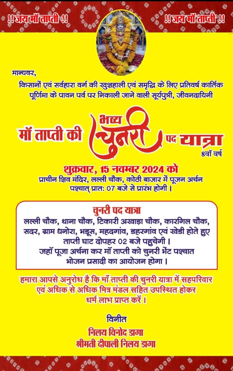 किसानों और सर्वहारा वर्ग की खुशहाली एवं समृद्धि के लिए मां ताप्ती चुनरी पद यात्रा इस वर्ष 15 नवंबर को भव्य स्वरूप में निकाली जाएगी। इस पावन यात्रा का आयोजन पूर्व विधायक निलय विनोद डागा द्वारा किया जा रहा है, जिन्होंने 11 वर्षों तक लगातार यह यात्रा निकालने का संकल्प लिया है। इस वर्ष यह यात्रा आठवें वर्ष में प्रवेश कर रही है। विगत 7 वर्षों से श्री डागा उनकी धर्मपत्नी श्रीमती दीपाली डागा के साथ यह पद यात्रा सफलतापूर्वक संपन्न कर चुके हैं। अब यह यात्रा बैतूल जिले का प्रमुख धार्मिक आयोजन बन चुकी है।