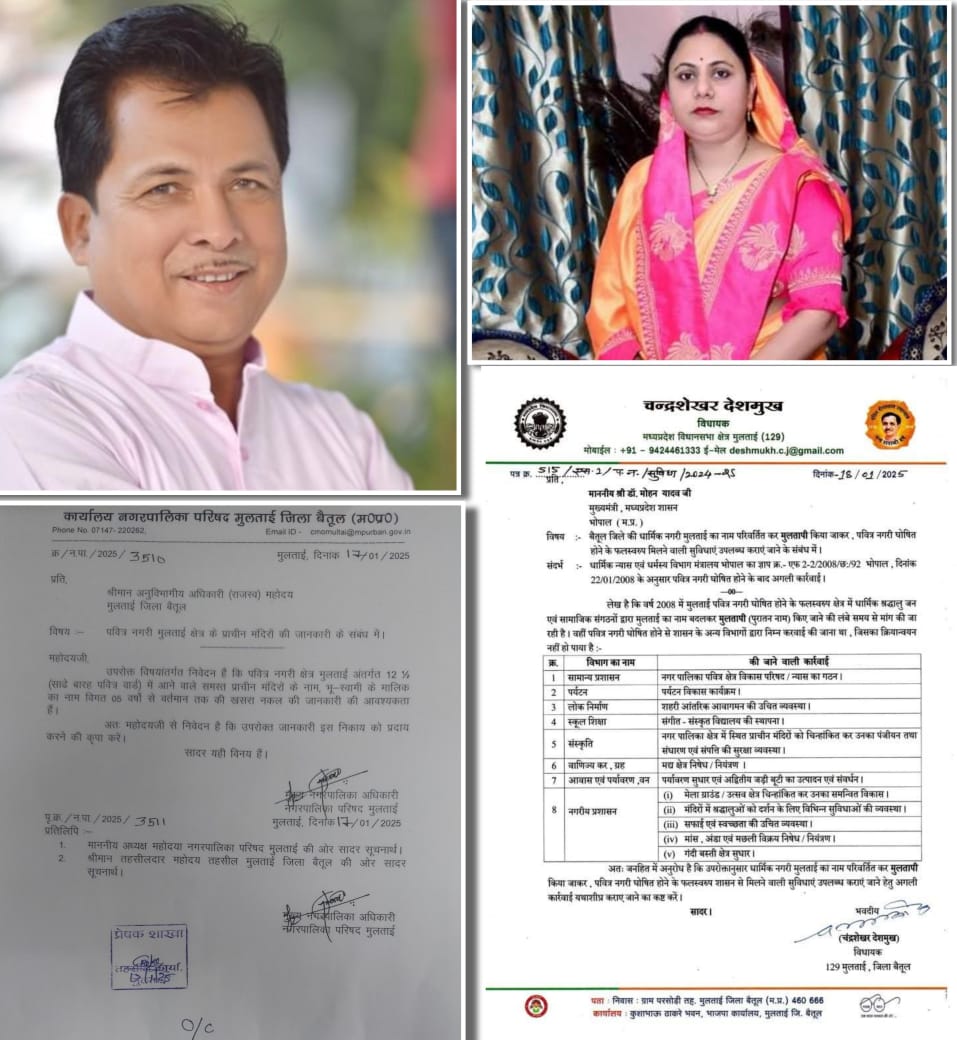 मुलताई के नाम को बदलकर उसके ऐतिहासिक और धार्मिक नाम ‘मुलतापी’ करने की मांग को लेकर एक बार फिर प्रयास तेज हो गए हैं। इस बार विधायक चंद्रशेखर देशमुख और नगर पालिका अध्यक्ष वर्षा गाडेकर के नेतृत्व में यह कवायद नई दिशा में बढ़ रही है। विधायक ने मुख्यमंत्री डॉ मोहन यादव को पत्र लिखते हुए मांग की है कि मुलताई को पवित्र नगरी घोषित करने की दिशा में लंबित कार्यवाही को जल्द पूरा किया जाए।