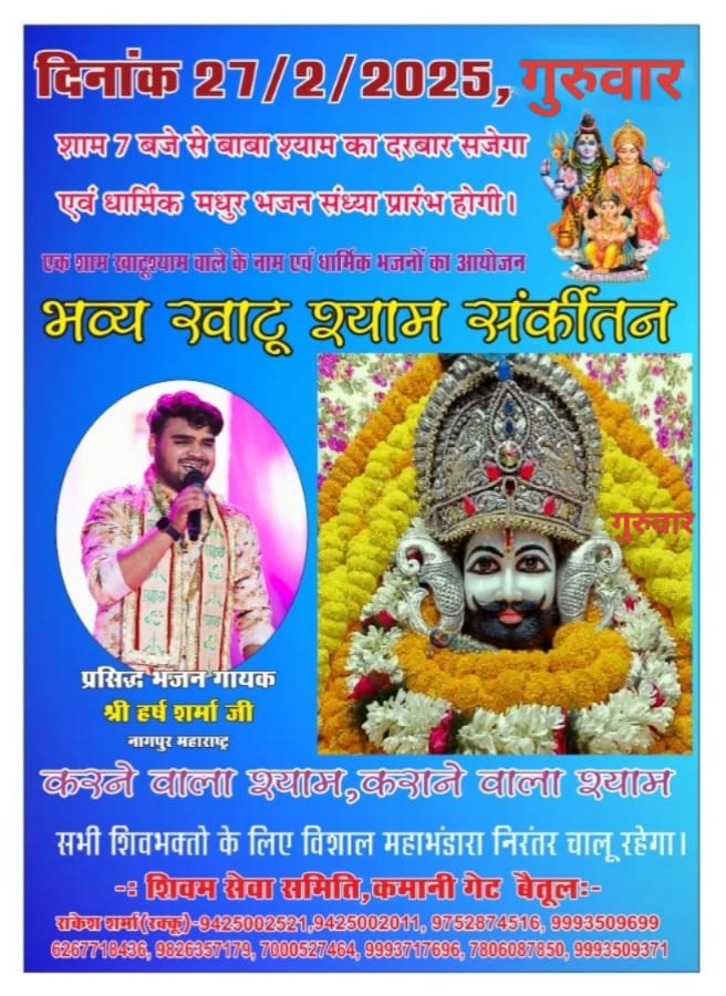 आज 27 फरवरी को भंडारा स्थल पर भक्तों के लिए विशेष भजन संध्या आयोजित की जाएगी। गुरुवार रात 7 बजे से बाबा श्याम का दरबार सजेगा, जिसमें प्रसिद्ध भजन गायक हर्ष शर्मा (नागपुर, महाराष्ट्र) अपने मधुर भजनों से श्रद्धालुओं को भक्ति रस में सराबोर करेंगे। इस दौरान विशाल भंडारा अनवरत जारी रहेगा, जिससे भक्तगण भगवान शिव और खाटू श्याम की भक्ति में लीन होकर प्रसादी ग्रहण कर सकें।