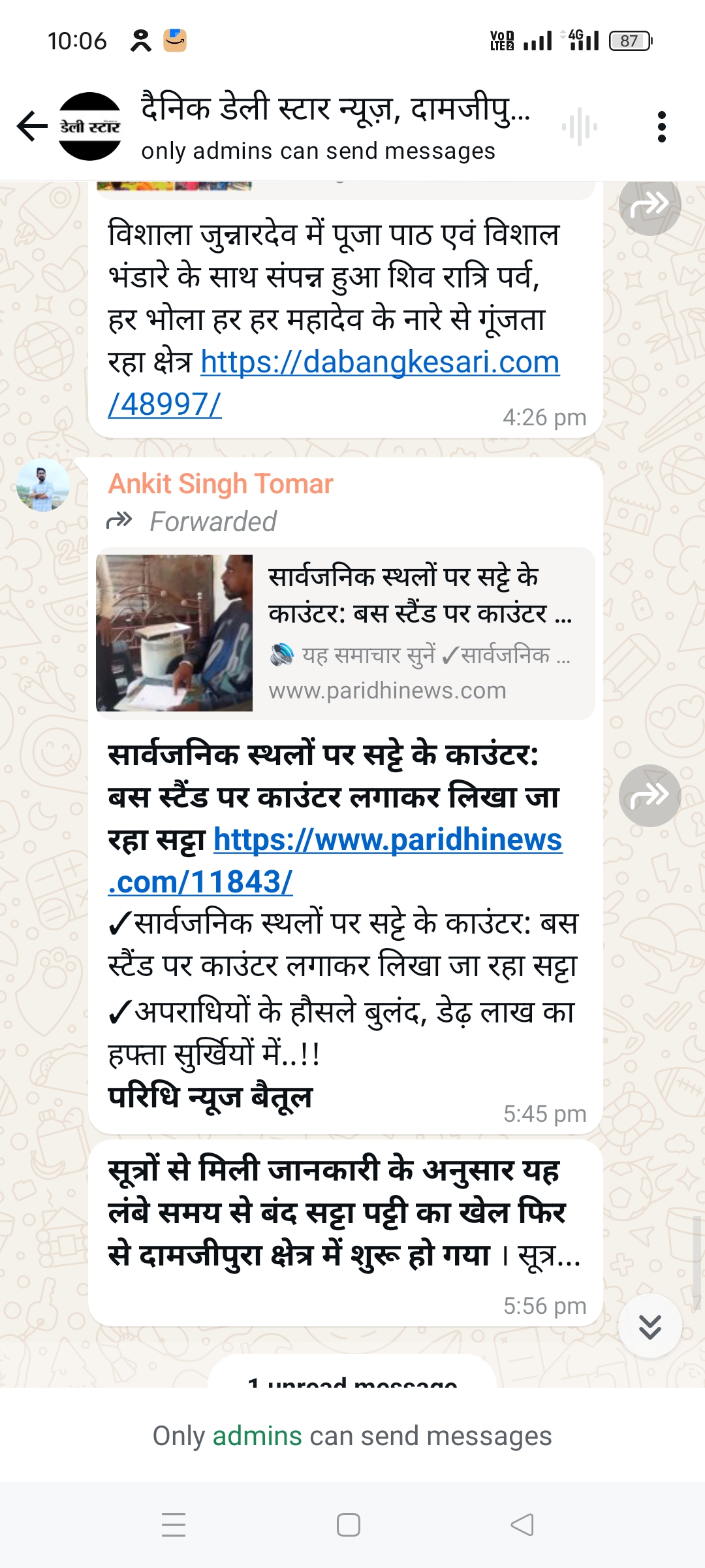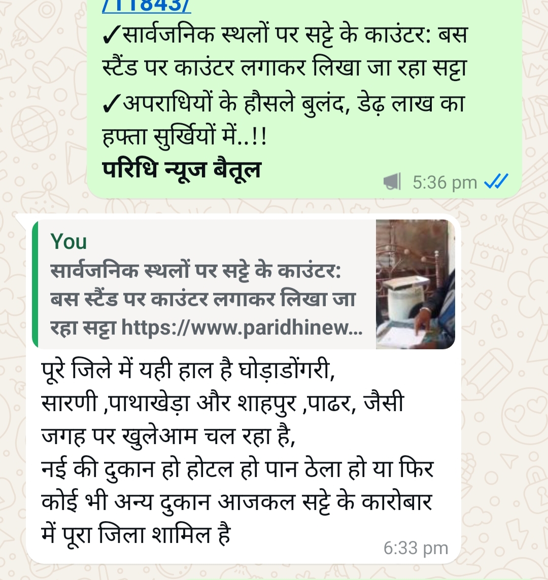 एक जागरूक नागरिक द्वारा परिधि न्यूज से जिले की स्थिति पर भी चिंता जाहिर की है तो दूसरी ओर दामजीपुरा के युवा पत्रकार ने भी एक व्हाट्स एप ग्रुप में प्रतिक्रिया दी है कि सट्टे का काउंटर तो दामजीपुरा में भी कुछ दिन बंद रहने के बाद वापस खुल गया है।देखना यह है कि अब जिले का पुलिस महकमा इन मामलों में क्या एक्शन लेता है।