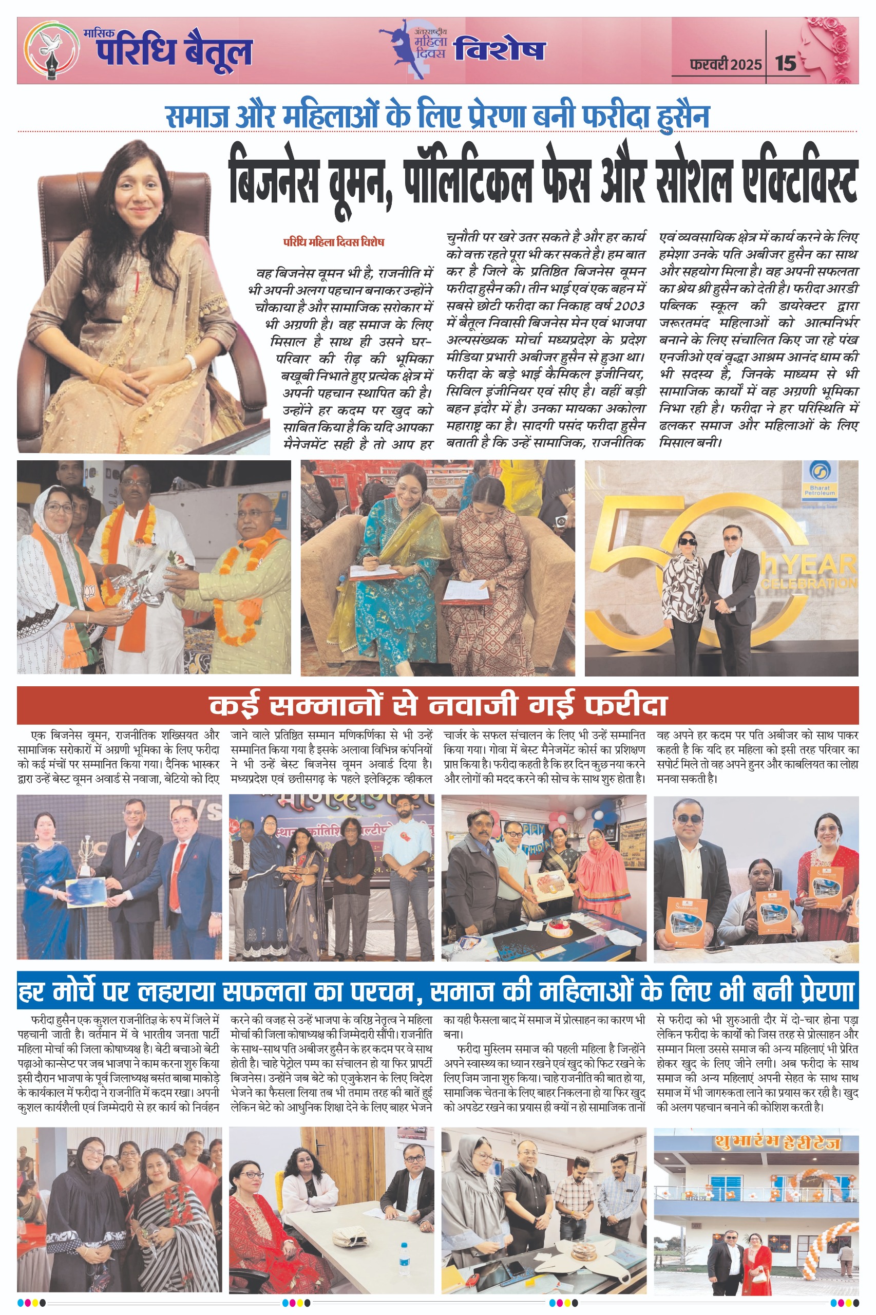 वह बिजनेस वूमन भी है, राजनीति में भी अपनी अलग पहचान बनाकर उन्होंने चौकाया है और सामाजिक सरोकार में भी अग्रणी है। वह समाज के लिए मिसाल है साथ ही उसने घर-परिवार की रीढ़ की भूमिका बखूबी निभाते हुए प्रत्येक क्षेत्र में अपनी पहचान स्थापित की है। उन्होंने हर कदम पर खुद को साबित किया है कि यदि आपका मैनेजमेंट सही है तो आप हर चुनौती पर खरे उतर सकते है और हर कार्य को वक्त रहते पूरा भी कर सकते है। हम बात कर है जिले के प्रतिष्ठित बिजनेस वूमन फरीदा हुसैन की। तीन भाई एवं एक बहन में सबसे छोटी फरीदा का विवाह वर्ष 2003 में बैतूल निवासी बिजनेस मेन एवं भाजपा अल्पसंख्यक मोर्चा मध्यप्रदेश के प्रदेश मीडिया प्रभारी अबीजर हुसैन से हुआ था। फरीदा के बड़ेे भाई कैमिकल इंजीनियर, सिविल इंजीनियर एवं सीए है। वहीं बड़ी बहन इंदौर में है। उनका मायका अकोला महाराष्ट्र का है। सादगी पसंद फरीदा हुसैन बताती है कि उन्हें सामाजिक, राजनीतिक एवं व्यवसायिक क्षेत्र में कार्य करने के लिए हमेशा उनके पति अबीजर हुसैन का साथ और सहयोग मिला है। वह अपनी सफलता का श्रेय श्री हुसैन को देती है। फरीदा हुसैन आरडी पब्लिक स्कूल की संचालक ऋतु खंडेलवाल द्वारा संचालित पंख एनजीओ एवं वृद्धाश्रम आनंद धाम की सदस्य  भी है।