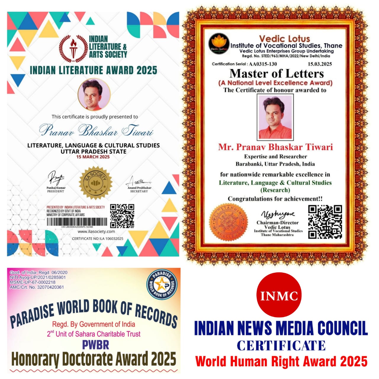 हिंदी साहित्य एवं पत्रकारिता के क्षेत्र में अप्रतिम योगदान हेतु बाराबंकी, उत्तर प्रदेश निवासी सुविख्यात साहित्यकार प्रणव भास्कर तिवारी शिववीर प्रीतम (संयोजक, राष्ट्रीय कवि संगम) को हाल ही में प्रतिष्ठित राष्ट्रीय सम्मानों से विभूषित किया गया है। उनके साहित्यिक सृजन, अनुसंधानशील प्रवृत्ति तथा पत्रकारीय समर्पण के फलस्वरूप उन्हें यह विशिष्ट गौरव प्राप्त हुआ है। इन पुरस्कारों ने हिंदी साहित्य-जगत में उनकी विद्वत्ता को और अधिक प्रतिष्ठित किया है।साहित्यपीडिया द्वारा उन्हें सर्टिफिकेट ऑफ अचीवमेंट से सम्मानित किया गया, जो उनकी कविता-लेखन प्रतिभा का प्रत्यक्ष प्रमाण है। उनकी कविताएँ गहन संवेदनाओं, सामाजिक यथार्थ एवं जीवन के विविध पक्षों को उभारने में सक्षम रही हैं। अनेक साहित्यिक मंचों एवं पत्र-पत्रिकाओं में उनकी रचनाएँ प्रशंसित हुई हैं। इसी क्रम में, इंडियन लिटरेचर एंड आर्ट्स सोसाइटी, कर्नाटक द्वारा उन्हें इंडियन लिटरेचर अवार्ड से सुशोभित किया गया, जो उनकी निरंतर साहित्यिक साधना एवं मौलिक लेखन के प्रति समर्पण को प्रतिपादित करता है।