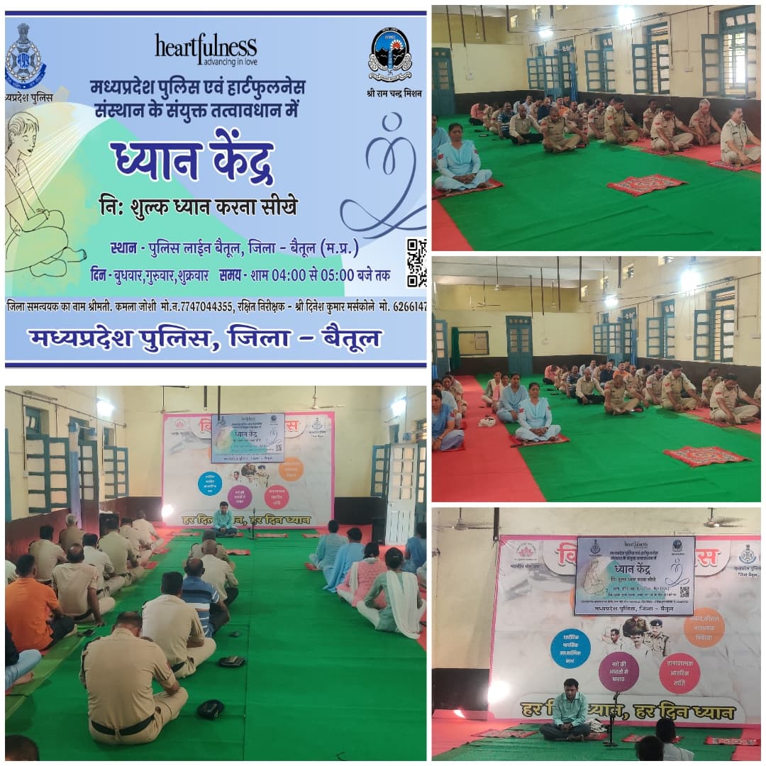 पुलिस अधीक्षक निश्चल झारिया के निर्देशन में जिला मुख्यालय सहित जिले के सभी थानों से पुलिसकर्मियों हेतु 3 दिवसीय “हार्टफुलनेस ध्यान का प्रशिक्षण एवं अभ्यास “ कार्यक्रम आयोजित किया जा रहा है।हार्टफुलनेस ध्यान केंद्र बैतूल जिला समन्वयक  रोहित बघेल द्वारा पुलिस अधिकारियों कर्मचारियों को उक्त प्रशिक्षण एवं अभ्यास कार्यक्रम में 1-ध्यान 2- क्लिनिंग 3- प्रार्थना का अभ्यास कराया गया।उक्त प्रशिक्षण एवं अभ्यास कार्यक्रम में सभी पुलिसकर्मियों को शाम 4:00 से 5:00 बजे प्रशिक्षण दिया जा रहा है । 03 दिवस प्रशिक्षण शिविर कार्यक्रम के दौरान थाना प्रभारी एवं समस्त स्टाफ उपस्थित रहे और उनके द्वारा ध्यान के उपरांत बहुत ही गहरे अनुभव साझा किए गए।उक्त ध्यान सत्र का आयोजन पुलिस कर्मियों के मानसिक, भावनात्मक, शारीरिक कल्याण को दृष्टिगत रखते हुए तनाव मुक्ति के उद्देश्य से किया गया है। हार्टफुलनेस संस्था और पुलिस विभाग से संयुक्त तत्वधान में किए गए MOU के अंतर्गत ध्यान सत्र जिले के सभी पुलिस अधिकारियों एवं कर्मचारियों हेतु संचालित किया जाना है ।