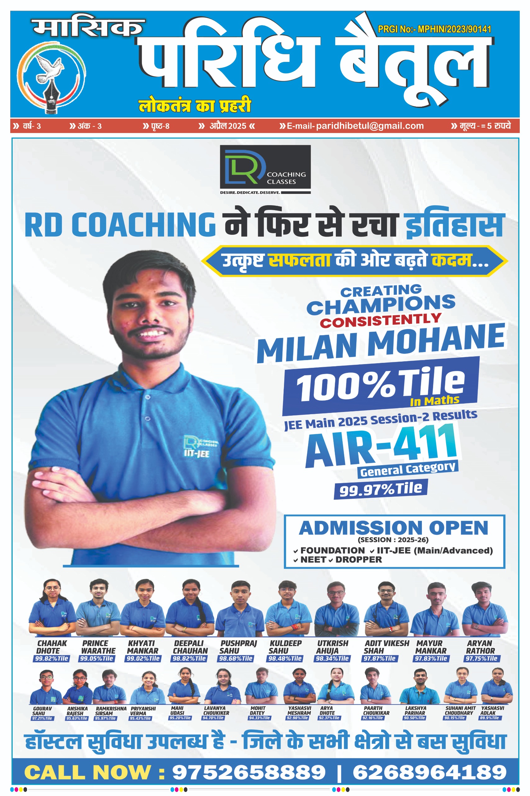 प्रतिष्ठित एवं उत्कृष्ठ कोचिंग संस्थान आरडीसीसी बैतूल का जेईई मेन्स सेशन-2 का शानदार परीक्षा परिणाम रहा। उत्कृष्ठ सफलता हासिल करने वाले छात्र-छात्राओं का कोचिंग प्रबंधन एवं शिक्षकों ने सम्मानित कर हौसला बढ़ाया साथ ही विद्यार्थियों ने भी खुशियां मनाई। आरडी कोचिंग क्लासेस बैतूल के विद्यार्थी मिलन मोहने ने गणित में 100 परसेंटाईल के साथ ओव्हर ऑल 99.97 परसेन्टाईल हासिल कर जिले का नाम रौशन किया।