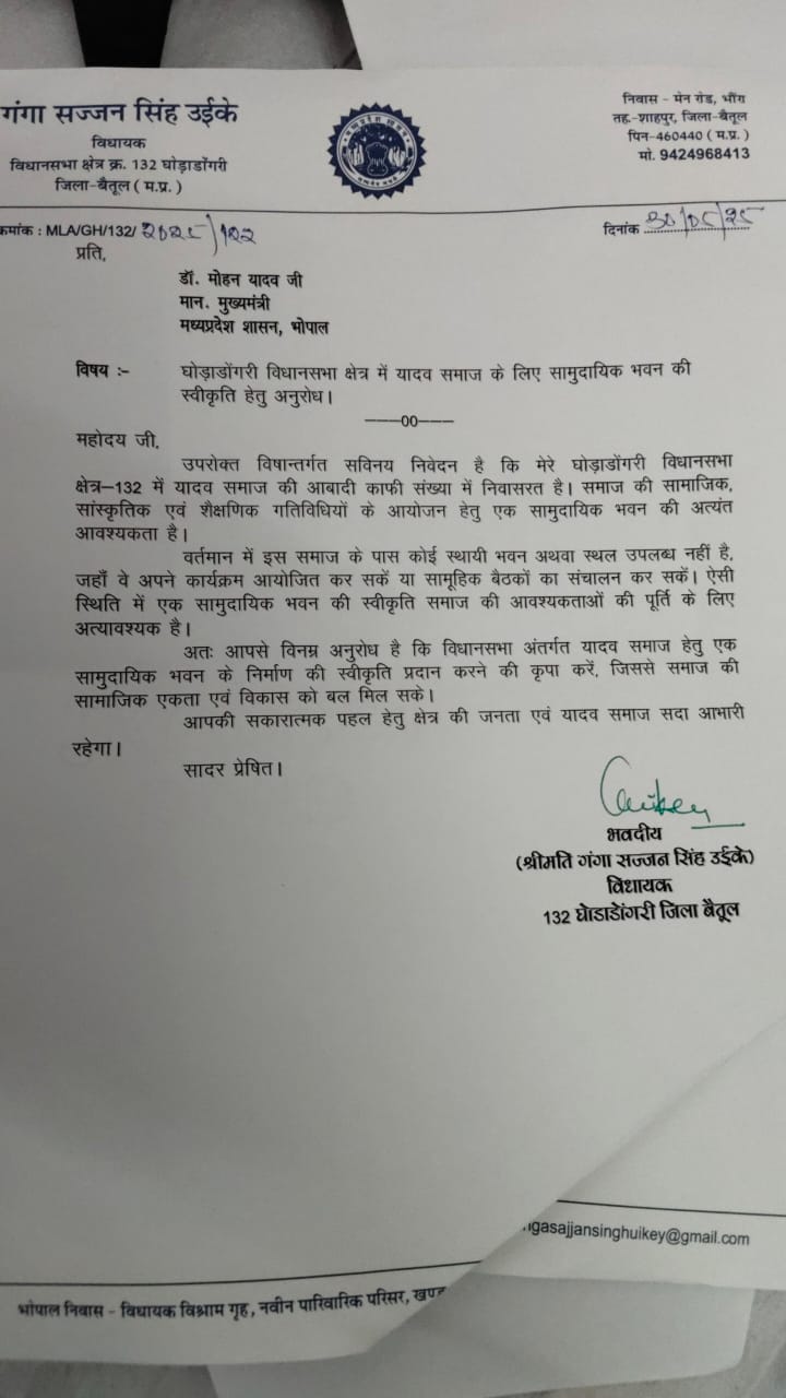 विधायक उईके ने मुख्यमंत्री को लिखा पत्र, यादव समाज के लिए सामुदायिक भवन की मांग की
