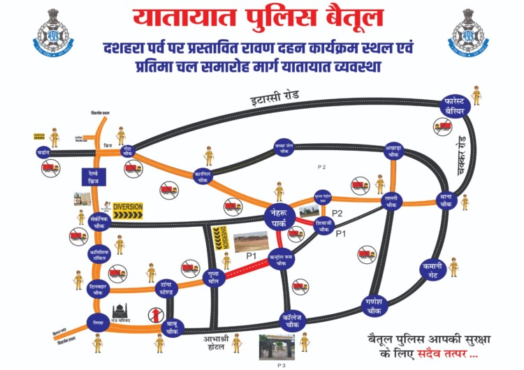 рдкреНрд░рддрд┐рд╡рд░реНрд╖рд╛рдиреБрд╕рд╛рд░ рдЗрд╕ рд╡рд░реНрд╖ рднреА рд╢рд╛рд░рджреАрдп рдирд╡рд░рд╛рддреНрд░рд┐ рддреНрдпреМрд╣рд╛рд░ рдПрд╡рдВ рджрд╢рд╣рд░рд╛ рдкрд░реНрд╡ рд╢рд╣рд░ рдореЗрдВ рдмрдбрд╝реЗ рд╣рд░реНрд╖реЛрд▓реНрд▓рд╛рд╕ рд╕реЗ рдордирд╛рдпрд╛ рдЬрд╛ рд░рд╣рд╛ рд╣реИред рдЬрд┐рд╕рдореЗрдВ рдмреИрддреВрд▓ рдирдЧрд░ рдореЗрдВ рдмрдбрд╝реА рд╕рдВрдЦреНрдпрд╛ рдореЗрдВ рдорд╛рдБ рджреБрд░реНрдЧрд╛ рдХреА рдкреНрд░рддрд┐рдорд╛рдПрдБ рд╕реНрдерд╛рдкрд┐рдд рдХреА рдЧрдИ рд╣реИрдВред рдЗрдирдХреА рдкреВрдЬрд╛/рджрд░реНрд╢рди рд╣реЗрддреБ рднрд╛рд░реА рд╕рдВрдЦреНрдпрд╛ рдореЗрдВ рд╢реНрд░рджреНрдзрд╛рд▓реБрдЧрдг рдЖ-рдЬрд╛ рд░рд╣реЗ рд╣реИрдВред рджрд┐рдирд╛рдВрдХ 02, 03 рдЕрдХреНрдЯреВрдмрд░ 2025 рдХреЛ рд╢рд╣рд░ рдХреЗ рд╡рд┐рднрд┐рдиреНрди рд╕реНрдерд╛рдиреЛрдВ рд╕реЗ рджреБрд░реНрдЧрд╛ рдкреНрд░рддрд┐рдорд╛рдУрдВ рдХрд╛ рдЪрд▓ рд╕рдорд╛рд░реЛрд╣ рдирд┐рдХрд╛рд▓рд╛ рдЬрд╛рдПрдЧрд╛ред рдЗрд╕ рджреМрд░рд╛рди рдЪрд▓ рд╕рдорд╛рд░реЛрд╣ рдореЗрдВ рд╢рд╛рдорд┐рд▓ рд╣реЛ рд░рд╣реЗ рджрд░реНрд╢рдХреЛрдВ рдПрд╡рдВ рдирд╛рдЧрд░рд┐рдХреЛрдВ рдХреЗ рд╕реБрдЧрдо рдпрд╛рддрд╛рдпрд╛рдд рд╣реЗрддреБ рдирд┐рдореНрдирд╛рдиреБрд╕рд╛рд░ рд╡реНрдпрд╡рд╕реНрдерд╛ рдХреА рдЧрдИ рд╣реИ тАУ