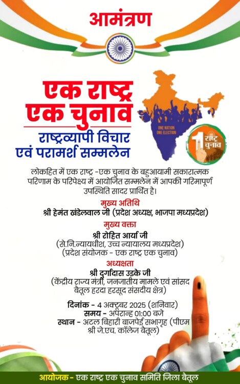लोकतंत्र को सुदृढ़ बनाने तथा चुनावी प्रक्रिया को सरल और पारदर्शी बनाने की दिशा में महत्वपूर्ण पहल मानी जा रही ‘एक राष्ट्र – एक चुनाव’ की अवधारणा पर विचार और विमर्श के लिए बैतूल के अटल बिहारी बाजपेई सभागृह (पीएम श्री जेएच कॉलेज बैतूल) में राष्ट्रव्यापी विचार एवं परामर्श सम्मेलन का आयोजन दिनांक 4 अक्टूबर 2025 को दोपहर 1 बजे किया जा रहा है।