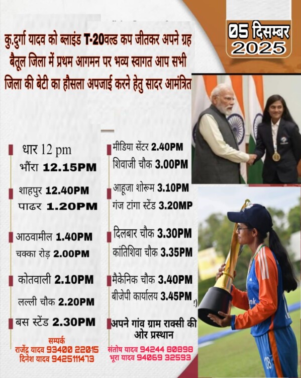 वर्ल्ड कप टी-20 ब्लाइंड वुमन क्रिकेट में भारत का परचम लहराने वाली होनहार खिलाड़ी दुर्गा येवले आज 5 दिसंबर शुक्रवार को गृह जिला बैतूल आएगी।