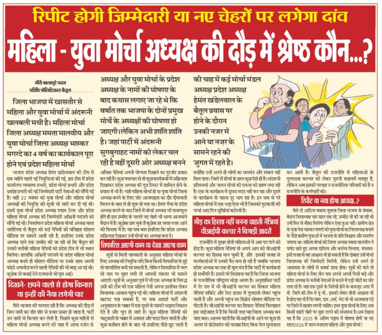 वैसे तो आदित्य बबला शुक्ला जिला भाजपा के बेबाक,बेदाग जिलाध्यक्ष चार साल तक रहे, उम्मीद भी की जा रही थी उन्हें फिर से मौका मिलेगा लेकिन ऐसा हुआ नहीं।ग्रामीण क्षेत्र के युवा नेता भास्कर मगरदे को युवा मोर्चा का जिलाध्यक्ष बनाने के पीछे ग्रामीण युवाओं में भाजपा के प्रति विश्वास और समर्पण जगाना था।महिला मोर्चा की जिला अध्यक्ष ममता मालवीय ने पार्षद रहते हुए अपना दायित्व और कर्तव्य निभाया, संभवतः इसी वजह से वह आश्वस्त भी हो सकती है कि दोबारा उन्हें मोर्चा जिलाध्यक्ष की जिम्मेदारी मिलेगी, लेकिन उन्हें अपने ही आसपास के लोगों से सतर्क रहना होगा। सूत्रों की माने तो महिला मोर्चा के लिए तीन नाम अपनी अपनी पैरवी बड़े और प्रदेश अध्यक्ष के करीबी नेताओं से कराने में एड़ी चोटी का जोर लगा रहे है। यहां एक दूसरे के विरोधी होने के बावजूद अगर मैं तो  जिले की टीम में तू भी..इसको लेकर तीनों आश्वस्त भी है।होड़ यह भी है कि साम, दाम ,अर्थ, भेद जो भी आजमाना पड़े पर जिले में छलांग लगनी चाहिए। इधर युवा मोर्चा के लिए अब किसी शहरी चेहरे पर मुहर लगने की संभावना है।अब देखना यह है कि 2025 के अंतिम पड़ाव में घोषणा होगी या नए साल2026 में जश्न मनाएगा महिला और युवा मोर्चा!