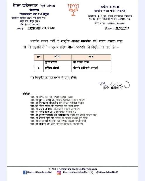 भाजपा प्रदेश अध्यक्ष हेमंत खंडेलवाल की टीम में एक महीने पहले नई नियुक्तियां की गई, इस टीम में प्रदेश कार्यालय व्यवस्था प्रभारी, प्रदेश मोर्चा प्रभारी और प्रदेश प्रकोष्ठ प्रभारी की नई जिम्मेदारी पार्टी नेताओं को सौंपी गई है। वहीं 22 नवंबर को युवा मोर्चा और महिला मोर्चा अध्यक्षों की नियुक्ति की सूची भी जारी कर दी गई थी। इसमें युवा मोर्चा प्रदेश अध्यक्ष श्याम टेलर और प्रदेश महिला मोर्चा अध्यक्ष की जिम्मेदारी अश्विनी परांजपे को सौंपी गई थी। निवर्तमान प्रदेश महिला मोर्चा अध्यक्ष माया नारोलिया से बैतूल की कई नेत्रियों की घनिष्ठता सोशल मीडिया पर सामने आती रही है, इसलिए उनके प्रदेश अध्यक्ष रहने तक उम्मीद की जा रही थी कि बैतूल की उनकी करीबी महिला नेत्रियों को प्रदेश टीम में भी स्थान मिलेगा।हालांकि अश्विनी परांजपे के प्रदेश महिला मोर्चा अध्यक्ष बनते ही सोशल मीडिया पर उनके साथ अपनी फोटो अपलोड करने वाली नेत्रियों की भी बाढ़ आ गई थी।कुछेक तो बधाई देने राजधानी भी घूम आई।दिखने- छपने वालो से होगा किनारा या इन्हीं की नैया लगेगी पार
