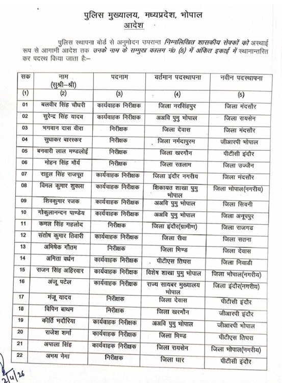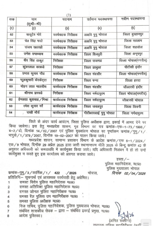 निरीक्षक रविकांत डेहरिया पांढुर्णा, अरविंद कुमरे रायसेन, राजन उईके छिंदवाड़ा,तो विकास पटेल नीमच से बैतूल स्थानांतरित, By Paridhi News Last updated Apr 4, 2026 🔊 यह समाचार सुनें Share