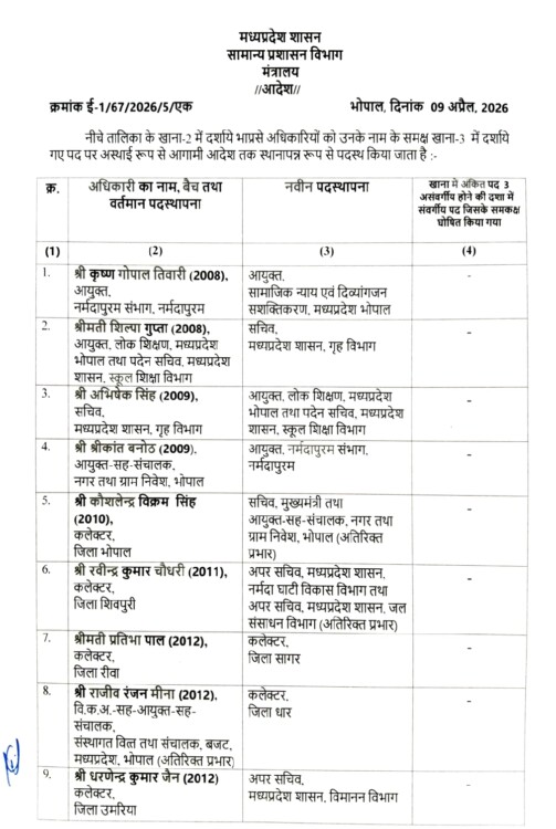 मध्य प्रदेश की मोहन यादव सरकार ने गुरुवार, 09 अप्रैल 2026 को प्रशासनिक स्तर पर एक बड़ी सर्जरी करते हुए 26 भारतीय प्रशासनिक सेवा (IAS) अधिकारियों के तबादला आदेश जारी किए हैं। सामान्य प्रशासन विभाग द्वारा जारी इस सूची में राजधानी भोपाल सहित कई महत्वपूर्ण जिलों के कलेक्टरों को बदला गया है। इस फेरबदल का मुख्य उद्देश्य शासन की कार्यप्रणाली में कसावट लाना और आगामी योजनाओं के क्रियान्वयन को गति देना माना जा रहा है।तबादला सूची में सबसे महत्वपूर्ण बदलाव राजधानी भोपाल के कलेक्टर पद पर हुआ है। भोपाल के वर्तमान कलेक्टर कौशलेंद्र विक्रम सिंह (2010) को अब मुख्यमंत्री कार्यालय (CMO) में सचिव के पद पर तैनात किया गया है। उनके अनुभव को देखते हुए उन्हें ‘आयुक्त-सह-संचालक, नगर तथा ग्राम निवेश’ का अतिरिक्त प्रभार भी सौंपा गया है। उनकी जगह प्रियंक मिश्रा (2013) को भोपाल का नया कलेक्टर नियुक्त किया गया है, जो इससे पहले धार जिले की कमान संभाल रहे थे।
