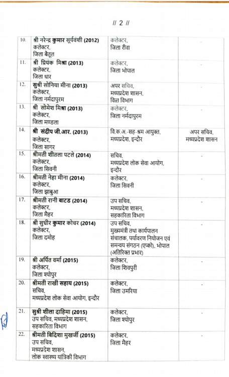 - प्रतिभा पाल (2012) को रीवा से हटाकर सागर कलेक्टर की जिम्मेदारी दी गई है।