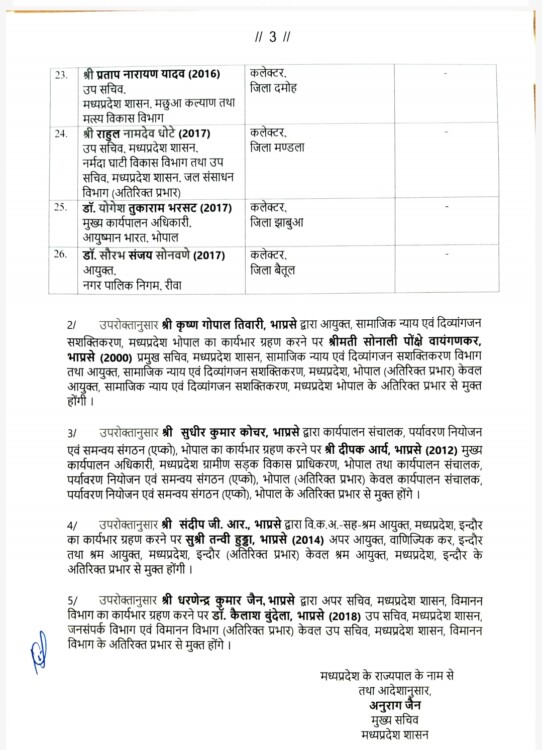 - आदिवासी बहुल जिलों में भी फेरबदल करते हुए डॉ. योगेश तुकाराम भरसट को झाबुआ और डॉ. सौरभ संजय सोनवणे को बैतूल कलेक्टर नियुक्त किया गया है।