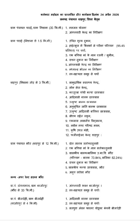 जिले के नवागत कलेक्टर डॉ. सौरभ संजय सोनवणे आज घोड़ाडोंगरी और शाहपुर क्षेत्र के दौरे पर है।उनका दौरा कार्यक्रम पूर्व निर्धारित और मिनट टू मिनट भी है,लेकिन यह यदि सार्वजनिक करने के लिए ही था तो शायद ही खामियां साहब को एक नजर में मिलेगी। माना कि खंड अधिकारियों को कलेक्टर के क्षेत्र में पहुंचने की जानकारी दी जानी चाहिए लेकिन मैदानी अमले को भी पता होगा तो व्यवस्था तो चाक चौबंद मिलेंगी ही। कलेक्टर डॉ. सौरभ संजय सोनवणे आज रात फोफल्या गांव में बिताएंगे यह क्षेत्र का दूरस्थ गांव है।