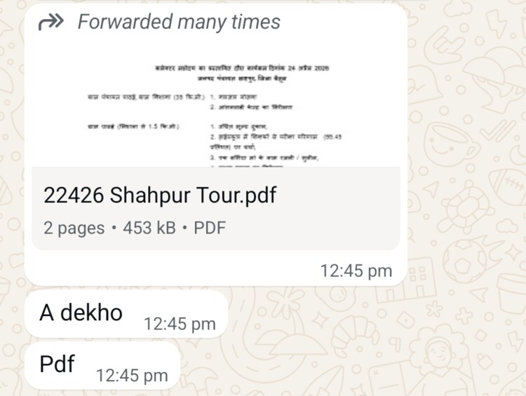 कलेक्टर का दौरा कार्यक्रम की पीडीएफ पूरे क्षेत्र ही नहीं अपितु जिलेभर में जमकर फॉरवर्ड हुई है। बहरहाल निशाना पाठई ग्रामों में निरीक्षण के दौरान कलेक्टर ने जब अपने सर पर गमछा बांधा तो उनका यह देशी अंदाज लोगों को भा गया।