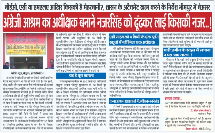 जिला मुख्यालय बैतूल से 100 किमी एवं आदिवासी बाहुल्य अंचल भीमपुर मुख्यालय से 50 किमी दूर गुरुवापिपरिया संकुल की प्राथमिक शाला भारी जमीन के वर्ग-3 शिक्षक नजरसिंह को आदिवासी बालक अंग्रेजी आश्रम शाला भीमपुर का अधीक्षक बनाया गया है। यह नियुक्ति अंग्रेजी आश्रम के अधीक्षक के निलंबन के बाद की गई। मप्र शासन ने अटैचमेंट खत्म कर दिया है, उस पर नजरसिंह को नियम विरुद्ध तरीके अधीक्षक बनाया गया है। बीईओ विशाल भोपले का कहना है कि सहायक आयुक्त ने शिक्षक नजर सिंह को अधीक्षक बनाने संबंधी प्रस्ताव उनसे नहीं मांगा, सीधे उपर से ही नियुक्ति की गई। इधर शिक्षा समिति भीमपुर ने भी अनुमोदन नहीं किया। ऐसे में सहायक आयुक्त विवेक कुमार पाण्डेय की नजरों ने अंतिम छोर के शिक्षक नजरसिंह को आखिर ढूंढा कैसे?