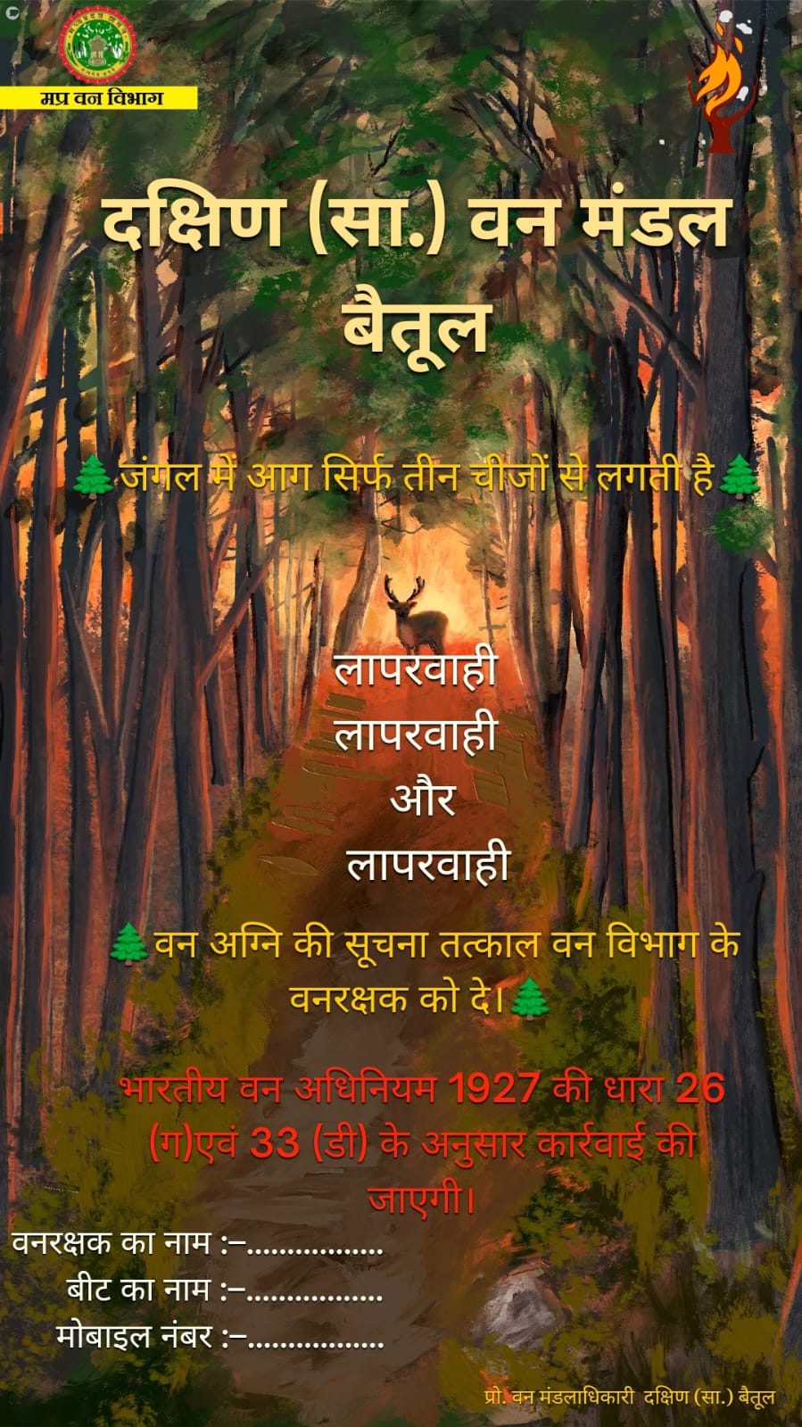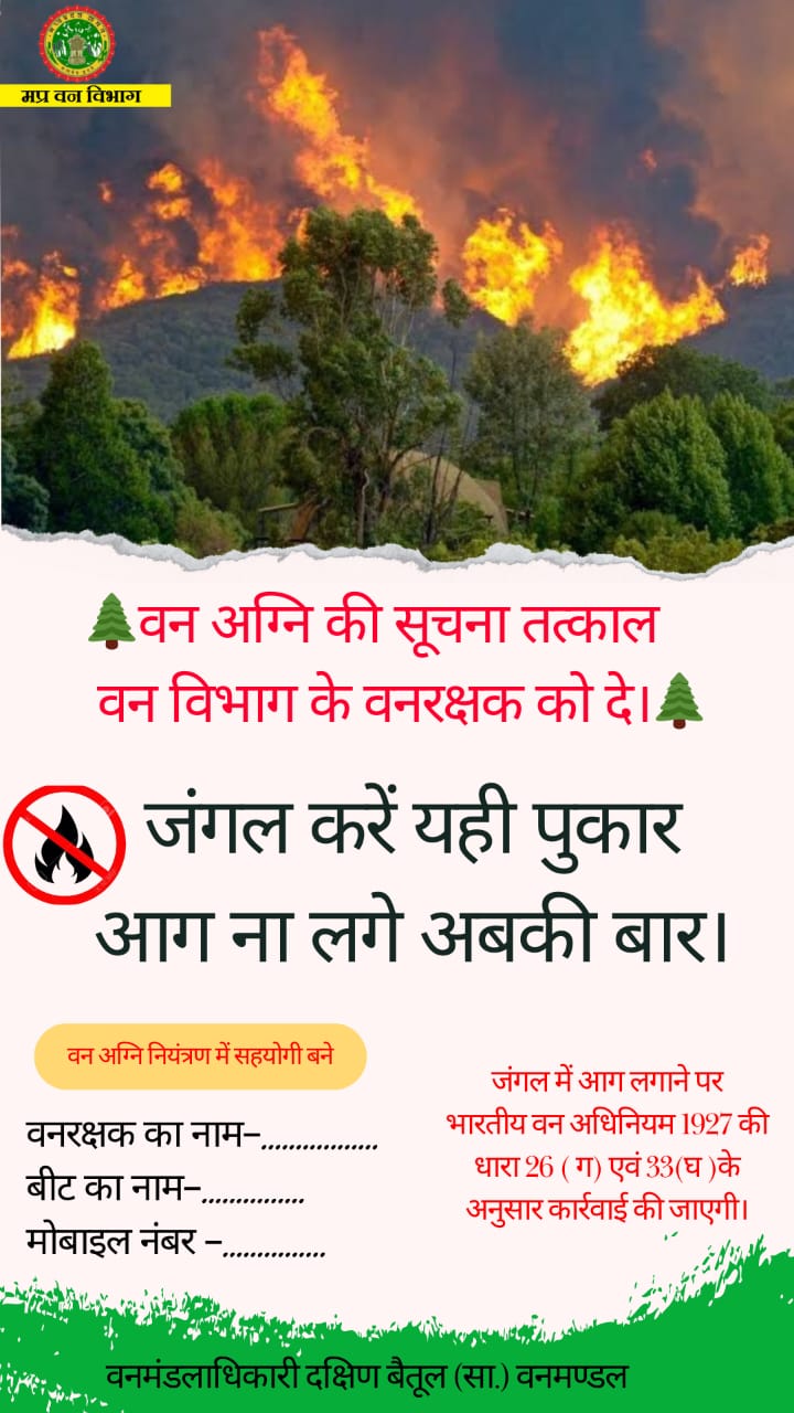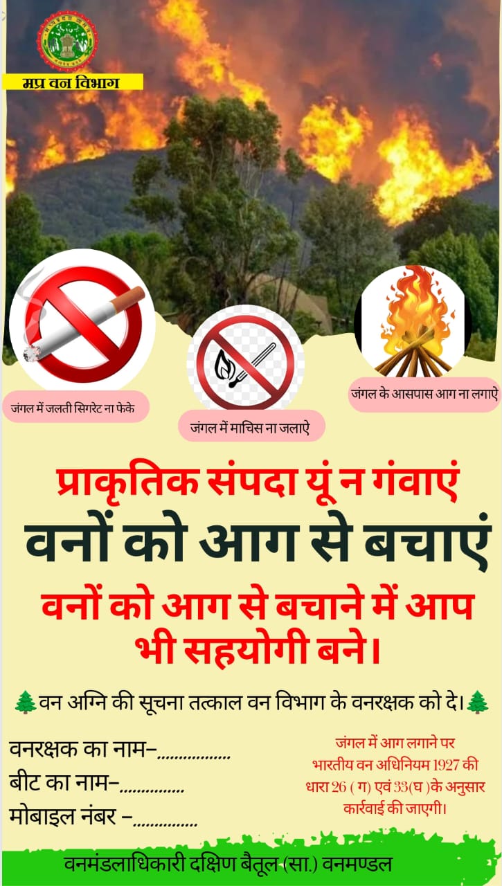 इन पंजीकरणों से एस.एम.एस. के माध्यम से आग की सूचना समय प्राप्त होगी, जिससे अग्नि प्रभावित स्थल पर अतिशीघ्र पहुंच कर आग बुझाने का कार्य समय पर किया जा सकेगा। वनमंडल अंतर्गत समस्त वनसुरक्षा एवं ग्राम वन समितियों की विशेष अग्नि सुरक्षा हेतु 114 बैठकें आयोजित की गई जिसमें माननीय मुख्य वनसंरक्षक, वन वृत बैतूल एवं वनमंडलाधिकारी दक्षिण बैतूल स्वयं भी उपस्थित रहे तथा ग्रामों में विभिन्न खेल प्रतियोगिता जैसे किकेट, वालिवाल, फुटबाल, कबड्डी आयोजित कर वनों को आग से बचाने हेतु ग्रामवासियों को प्रेरित किया गया। वनों को आग से बचाने हेतु जागरूकता शिविरों का भी आयोजन किया गया तथा वन अग्नि सुरक्षा हेतु पोस्टर पेम्पलेट प्रत्येक ग्राम में उचित स्थानों पर चस्पा किये गये है। साप्ताहिक बाजारों में मुख्य स्थानों पर ऑडियों / वीडियों के माध्यम से वनों में आग नहीं लगाने हेतु आमजन को जागरूक किया गया। वनों को आग से बचाने हेतु “SOP”, “वन अग्नि दिशा निर्देश” जारी किये गये। चूकिं आग स्वयं नहीं लगती अतः ऐसे कृषिभूमि क्षेत्र जो कि वन सीमा के नजदीक है कृषिभूमि धारकों को विशेष रूप से आग न लगाने हेतु प्रेरित किया गया है। ग्रामवासियों को महुआ वृक्षों के नीचे आग न लगाने हेतु समझाईश दी गई, नेट के माध्यम से महुआ संग्रहण कार्य करने हेतु प्रेरित किया गया।