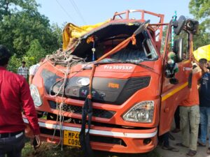 अनाज भरकर भीमपुर से नांदा की ओर जा ट्रक अनियंत्रित होकर पलटा दो लोग जख्मी
